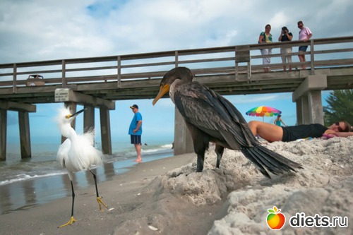 Ушастый баклан защищает свою территорию от белой американской цапли на пляже в Нейплсе, штат Флорида, США