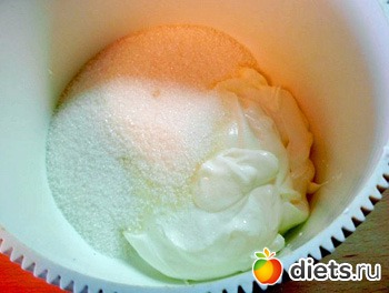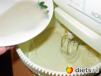 Не прекращая взбивать сметану с сахаром, тонкой струйкой влить в нее желатиновую смесь.