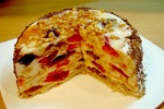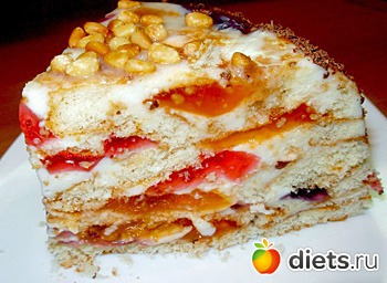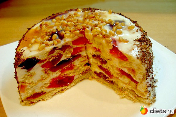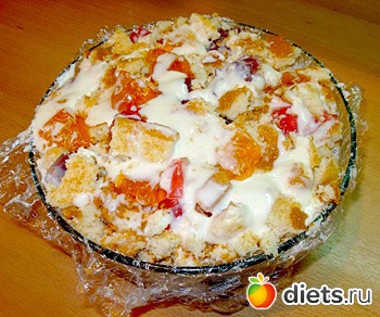 Опять набросать слой кусочков, полить кремом и так далее.