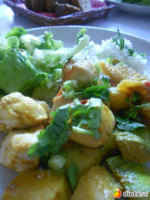 Ужин - доедали карри из курицы с яблоком и овощами, я уже без риса, только с салатными листьями: