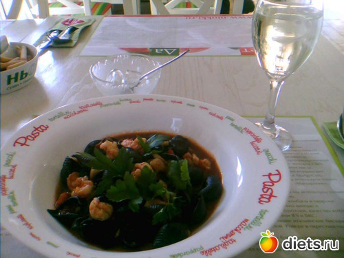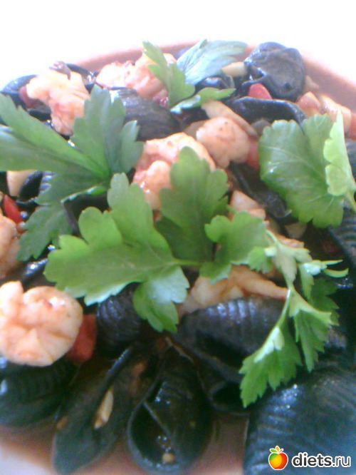 Это были черные конкильи с креветками и кальмарами с бокалом белого вина со льдом: