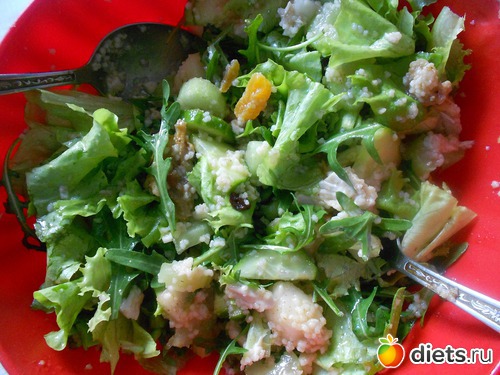 куриной грудки, салатных листьев и рукколы, огурца, сельдерея, груши, кураги, изюма, кус-куса чуть-чуть, заправила оливковым маслом со специями и чесночком, получился такой "стиль ориенталь":