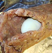 Раскладываем на фольге часть фарша, кладем на него 2 яйца.