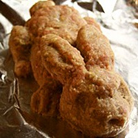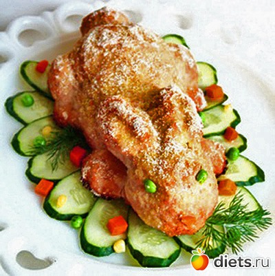 Из оставшегося фарша делаем лапы, хвост, голову и уши. Посыпаем "зайчика" панировкой, закрываем фольгой и выпекаем в духовке 1,5 часа при температуре 180-200 гр. С.
