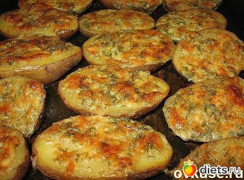 на каждую картошину чесночное масло и ставим в разогретую до 250 г духовку.