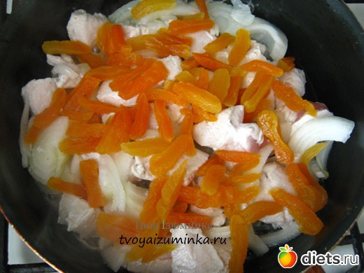 Курагу помыть, обдать кипятком и залить горячей водой для разбухания (у меня купленная курага оказалась мягкой и поэтому мне это делать не пришлось). Куриные грудки обмыть и порезать небольшими кусочками, лучше куриное мясо резать поперек волокон. Посолить и приправить нарезанные кусочки традиционной для куриного мяса приправой – кари, которая придаст куриному мясу не только пикантный вкус, но и красивый золотистый цвет. Выложить порезанное филе курицы на разогретую сковороду и обжарить в двух сторон на подсолнечном масле. Репчатый лук очистить, порезать полукольцами и добавить в сковороду тушиться к курочке. Курагу нарезать вдоль соломкой и добавить в сковороду.
