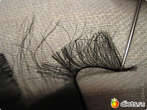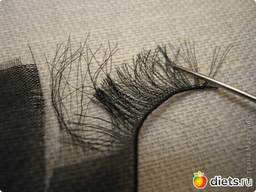 Начинаем иголкой по разрезанному краю убирать продольные нити, а поперечные и будут составлять будущие волоски наших ресничек.