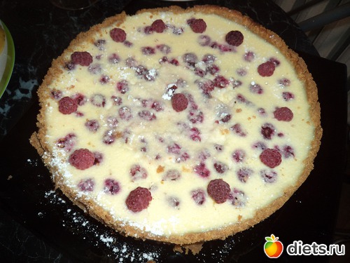 Достаем корж. Выкладываем на него малину и заливаем творожной массой.