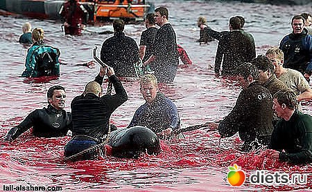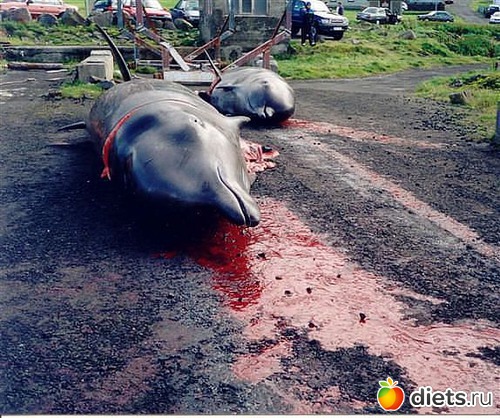 Именно на этих островах, на полпути между Шотландией и Исландией, китов – обыкновенных черных дельфинов, или гринд – убивают целыми стаями. Убивают не ради денег, а для забавы – островитяне считают такое убийство хорошим развлечением. По берегам бухты в ожидании кровавого шоу выстраиваются зеваки с детьми и детскими колясками. Воды бухты, в которую катерами загоняют целые стаи дельфинов, становится алой от крови. В год фарерцы убивают таким образом 950 гринд.