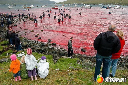 Именно на этих островах, на полпути между Шотландией и Исландией, китов – обыкновенных черных дельфинов, или гринд – убивают целыми стаями. Убивают не ради денег, а для забавы – островитяне считают такое убийство хорошим развлечением. По берегам бухты в ожидании кровавого шоу выстраиваются зеваки с детьми и детскими колясками. Воды бухты, в которую катерами загоняют целые стаи дельфинов, становится алой от крови. В год фарерцы убивают таким образом 950 гринд.