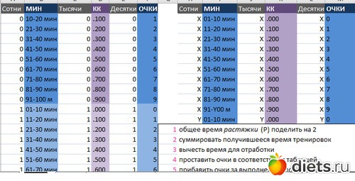 Добавлю фотографии таблиц, по которым подсчитывала очки (таблица соответствия времени тренировок - сжигаемым калориям - очкам)