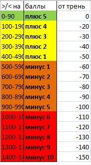 А это таблица вычитаемых минут за недоборы и переборы + таблица подсчета баллов для Марафона