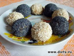 Продукты: 150 гр.хорошо отжатого творога, 100 гр.молотых овсяных хлопьев, 1 спелый банан, для обваливания - мак, грецкие орехи, кокосовая стружка выбирайте что-то одно.