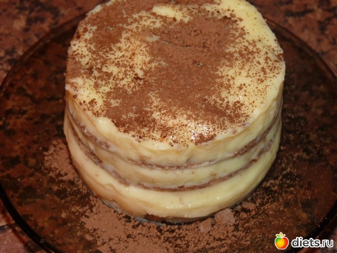 Подготовить креманки для тирамису, вырезать из бисквита необходимое количество кружков. Добавляйте в каждую креманку слой бисквита, слой крема и посыпьте какао. Убрать в холодильник минимум на 30 минут.