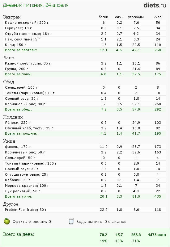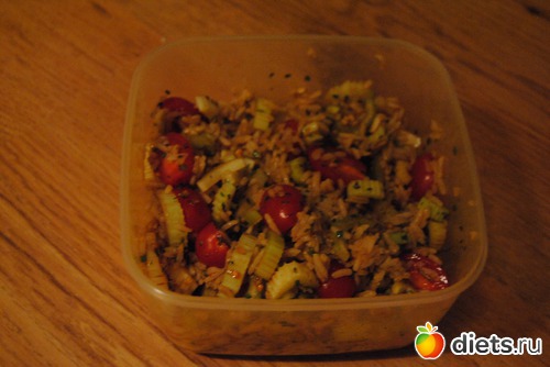 рис +/- 80гр +сельдерей 100гр + помидорки 70гр + соевой соус 30гр (просто вареный рис с сырыми овощами перемешала) + чай имбирный 500 мл