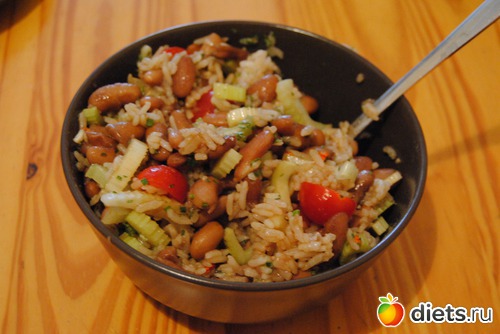 50 гр риса + 100 гр фасоли + соевый соус 30гр + сельдерей 50гр + помидорки 50гр