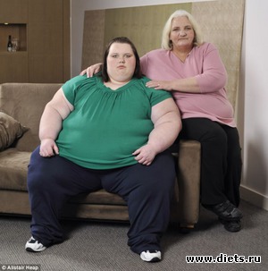 Буквально сегодня утром прочитала про историю Джорджии Девис -- юной 20-летней девушки из Великобритании, которая борется сейчас за жизнь в госпитале. Она очень тучная, весит около 300 кг. Что привело её на больничную койку? Режим питания в семье. Вот она на фотографии вместе с мамой: