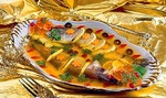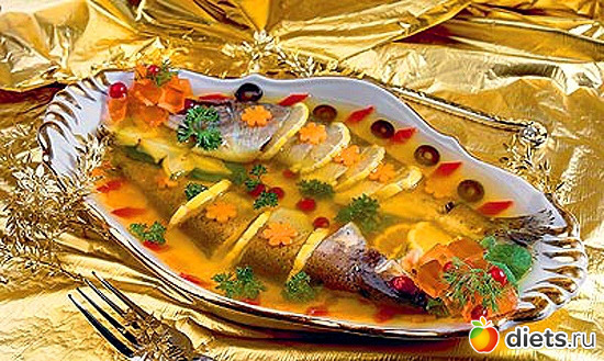 Красиво уложить рыбу в блюдо, залить отваром и поставить в прохладное место. Заливную рыбу можно украсить лимоном, кусочками моркови, оливками и зеленью
