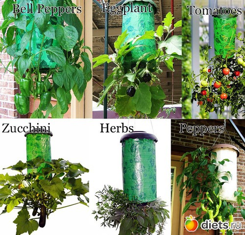 Вот нашла идеи для "висячих огородов". Возможно, вам понравятся идеи, а главное - они помогут вам собрать урожай. Topsy Turvy - это революционное изобретение в садоводстве. Topsy Turvy - это линия специальных подвесных емкостей, где растения располагаются "кверх ногами". Да, да это не опечатка. Посмотрите видеоролик, представленный внизу страницы и вы всё поймете...