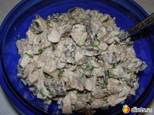 порезать куриное филе на маленькие кубики, добавить охлажденные грибы с луком и порезанный на кусочки белковый блин. заправить смесь готовой заправкой и убрать в холодильник на несколько часов для пропитки!