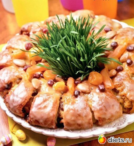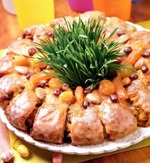В центр кольца поместить формочку, смазанную сливочным маслом. Накрыть полотенцем и оставить подходить на 30 минут. По краю кольца сделать надрезы. Выпекать при 180° 40 минут. Остудить.