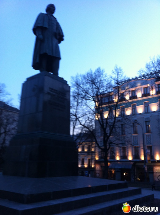 Гоголь Николай Васильевич провожает меня домой у начала бульвара своего имени. Темно уже, качество телефонной фотографии оставляет желать. Но есть настроение.
