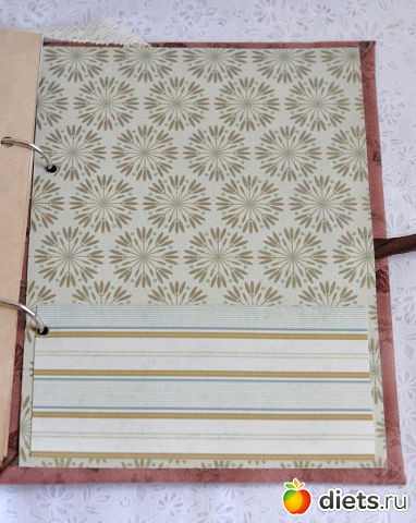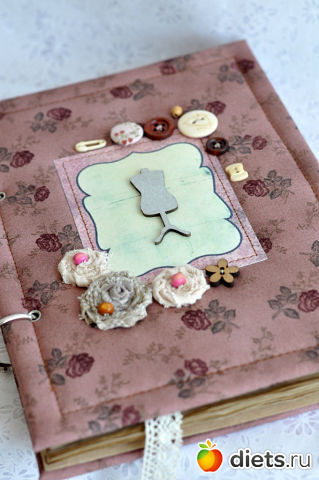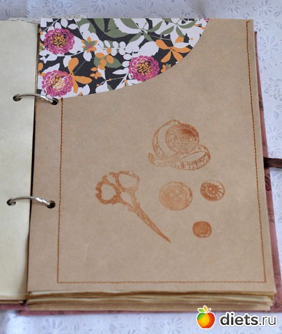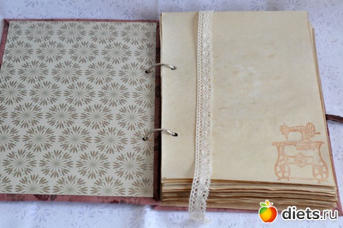 Блокнот сделан в винтажном стиле. Странички состарены кофе и ванилином - пахнут! Каждая проштампована! А теперь о главном! Блокнот очень практичен тем, что он на кольцах! Разжав их вы сможете добавить вырезки, дополнительные странички, удалить ненужные. Также в блокноте есть 4 кармашка из крафтбумаги, куда вы сможете также помещать вырезки или мелкие выкройки или еще что-то! Есть еще и пятый кармашек на форзаце для визиток или мелких записок! Завязки из бархатной ленты, закладка из хлопкового кружева. Формат А5