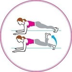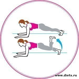 Займите позицию, как при отжимании, обопритесь на предплечья. Основной вес тела перенесите на руки. Не теряя равновесия, согните левую ногу в колене и дважды потяните пятку к ягодицам. Верните ногу в исходное положение, повторите с правой ноги. По 10 раз.
