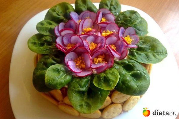 Уложить кружочки редиса немного внахлест, в виде лепестков цветка, слегка погрузив в салат.