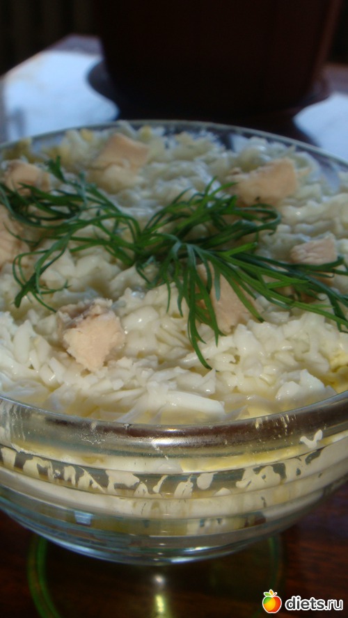Курогрудь отварить и порезать кусочками(я в след. раз просто разделю на волокна), , след. слой кисло-сладкое яблоко натереть на мелкой терке, затем сыр на мелкой терке, перетертые желтки и белки, каждый слой промазывать майонезом(я заменила сметаной), украсить зеленью.