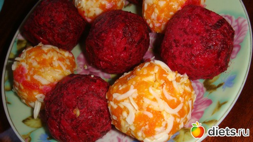 Свеклу и морковь отварить. Натереть в разные чашки, соеденить с перетертым сырком, затем к свекле добавить желтки, к морковке-белки с чесноком, скатать шарики, в морковный шарик прячем кусочек чернослива(как вариант можно орешек), в свеклу заворачиваем кусочек селедочки.
