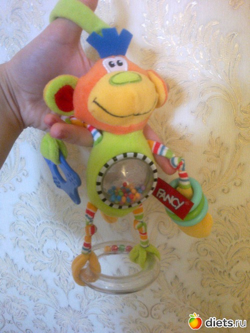 С обезьянки эстетики никакой, но по функциональности хорошая. Сама на резинках - прыгает немножко когда мася играется с ней. Кольцос разноцветными шариками которые тарохтят ей удобно брать маленькими ручками. Одна ручка макаки держит что-то типа звезды на которой поверхность различной фактуры - полезно для маленьких пальчиков, На другой одеты кольца - полезно для развития мелкой моторики. Также в эту ручку встроеная пищалка - звуковой сигнал. А ушки шелестят.