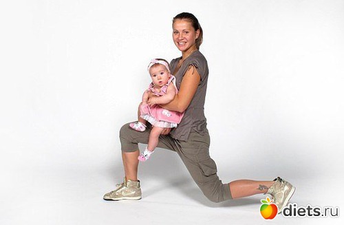Возьмите ребенка на руки, поверните спиной к себе, обнимите и прижмите. Правой ногой сделайте широкий шаг вперед. Сгибая колени, опуститесь в выпад. Следите за тем, чтобы голень правой ноги была перпендикулярна полу, а левое колено направляйте в пол. Вернитесь в исходное положение и повторите.