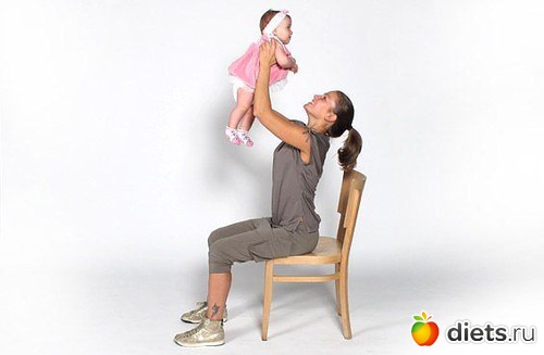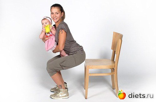 Возьмите ребенка на руки, обнимите и прижмите к себе. Встаньте перед стулом, повернувшись к его сиденью спиной. Напрягите мышцы живота, спина прямая. Присядьте, отводя ягодицы назад. Коснувшись сиденья, медленно вернитесь в исходное положение и повторите.