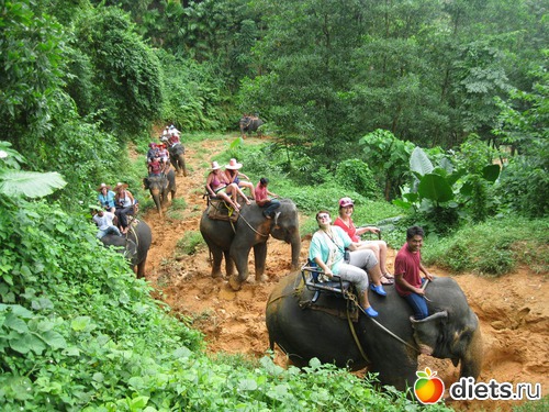 А под ногами у них развезенная в кашу глина. Все бы ничего, но джунгли там гористые, ноги у слонов расползаются... А нам гид посоветовала посидеть на шее у слона. Погонщик предложил, я согласилась. Сползла с диванчика ему на шею, а высоко - страшно... Я то думала: сейчас сфоткаюсь и назад переползу... Ага, как бы не так. Погонщик слона палочкой стукнул и тот пошагал... Напомню что местность гористая, земля - каша, держаться не за что, разве что за уши... Была одна мысль, когда он с горки сползал - только бы под ноги ему не свалиться... Руки потом тряслись часа два...
