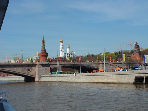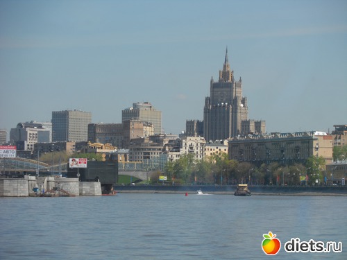 На Новоспасском причале народу было не много (видимо, все смотрели парад), и мы быстро разместились на верхней палубе теплохода. Прогулка очень понравилась - за потора часа мы проплыли через весь центр города и увидели множество достопримечательностей (в принципе, после можно было бы и домой возвращаться).