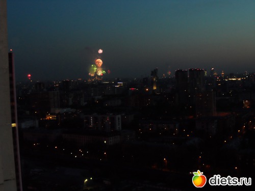 P.S. Да... Ещё рассказать забыла. В Москве салют "стреляли" из 14 точек. Одна из них была в Измайловском парке - недалеко от нас, и мы ужасно расстроились, когда узнали, что окна нашего номера выходят на город, а не на парк. Но, оказывается, из окна 28 этажа можно увидеть гораздо больше - 6 из 14 "салютов", по крайней мере, мы разглядели.
