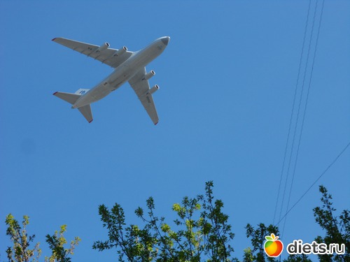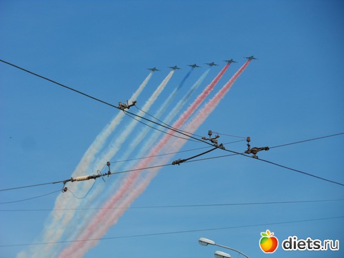 Первым делом, мы отправились на теплоходную прогулку по Москва - реке. Только вышли из метро, как с Красной площади после парада стали "разлетаться" самолеты.