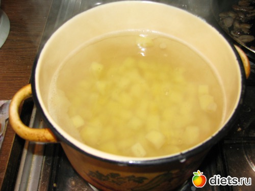 В кострюльке кипятим 2 литра воды, кладем туда картофель, очищенный и нарезанный кубиками 1 см.