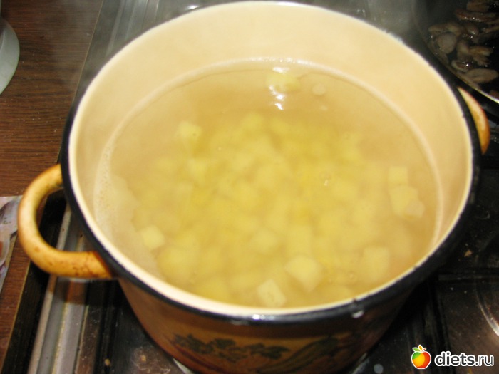 В кострюльке кипятим 2 литра воды, кладем туда картофель, очищенный и нарезанный кубиками 1 см.