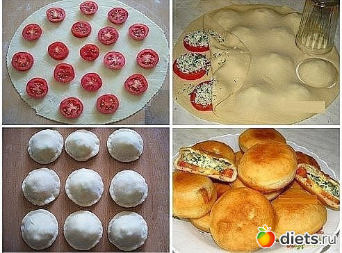 Cтаканом подходящего диаметра вырезать пирожки по контурам каждого кружочка помидора, так поступаем со всеми пирожками.