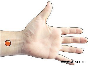Чтобы отыскать эту точку, нужно положить ладонь левой руки на внутреннюю сторону правой так, чтобы мизинец касался края кисти. В центре той линии, по которой указательный палец будет касаться правой руки, и будет находиться эта точка.