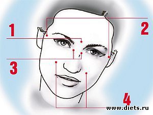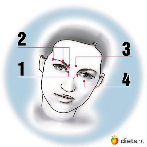 Точка № 3. Две симметричные точки над краями бровей, в том месте, где линия роста волос делает так называемый уголок. Нажимать в верхнюю «вершину» этого уголка.