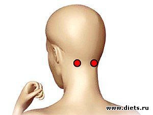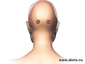 Искать эту точку следует на голове, а точнее, на затылке. Нужно приложить к затылку правую руку так, чтобы мизинцем она касалась правого уха, и по воображаемой линии между мочками ушей отмерить от все те же четыре пальца. Там, где эта «линия» пересечется с краем указательного пальца, и будет находиться точка.