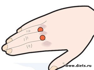 Эти две точки находятся на кисти руки по бокам костяшки среднего пальца в том месте, где фаланга пальца стыкуется с суставом. Нажимать следует одновременно с двух сторон до появления легких болевых ощущений.