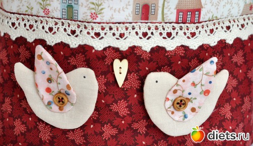 Комплект для кухни (грелка для чайника и прихватка) "Милый дом" Уютный и теплый в прямом смысле этого слова комплект для Вашей кухни! Грелка для чайника или кастрюльки регулируется под нужный размер с помощью завязок и пуговиц! Прихватку можно использовать и как подставку под горячее - размеры позволяют! Внутри комплекта синтипон и фланель! С такими вещицами можно без конца чаевничать и вести неспешные беседы - чайник не остынет! Комплект будет прекрасным подарком семейной паре или на новоселье! Объемная аппликация - птички символизирует дружную семью и счастье в доме!