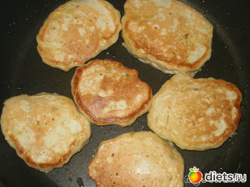 Разогреваем сковороду, вливаем немножко оливкового масла. Выкладываем ложкой оладьи на сковороду и жарим с обеих сторон.