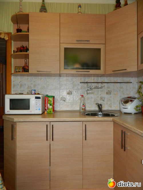 Это наша первая кухня и когда я решала как ее сделать боялась переборщить, поэтому получилось НИКАК!