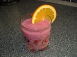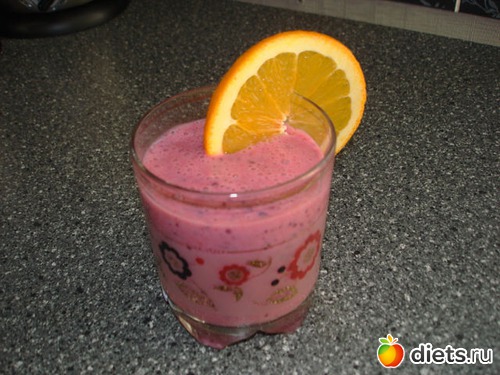 Всё взбить в блендере, перелить в бокал, украсить долькой апельсина.