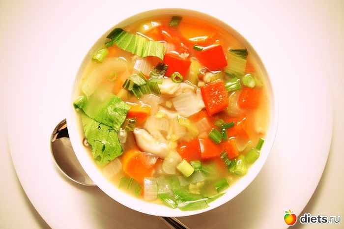Доводим суп до кипения, после чего сбавляем огонь и варим без крышки на слабом кипении еще около 30 минут. Где-то за 15-20 минут до окончания варки добавляем в суп молотый острый красный перец - он улучшает пищеварение и, следовательно, способствует похудению.